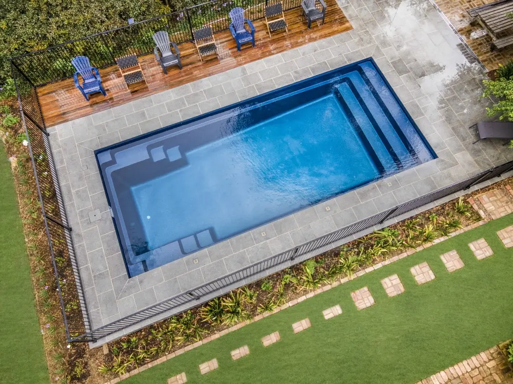 A tanning ledge is a shallow area built into the pool that allows you to relax in the water without fully swimming. It’s ideal for lounging, cooling off on hot days, or enjoying the pool with young children. Tanning ledges are a popular feature for homeowners who want both comfort and style built into their fiberglass pool.