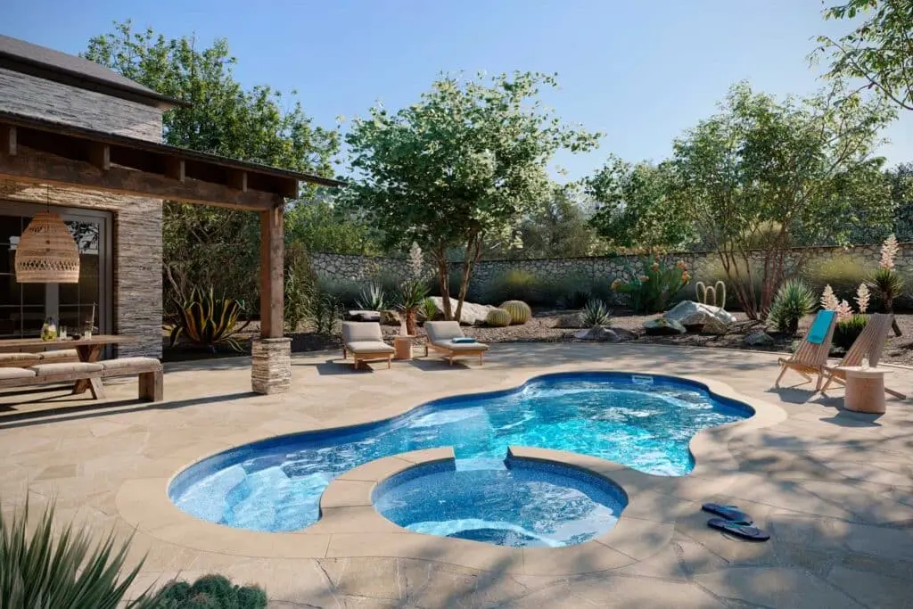 Relax and unwind in the Bermuda 12, a compact freeform fiberglass pool that brings resort-style comfort to smaller backyards without sacrificing style or functionality.